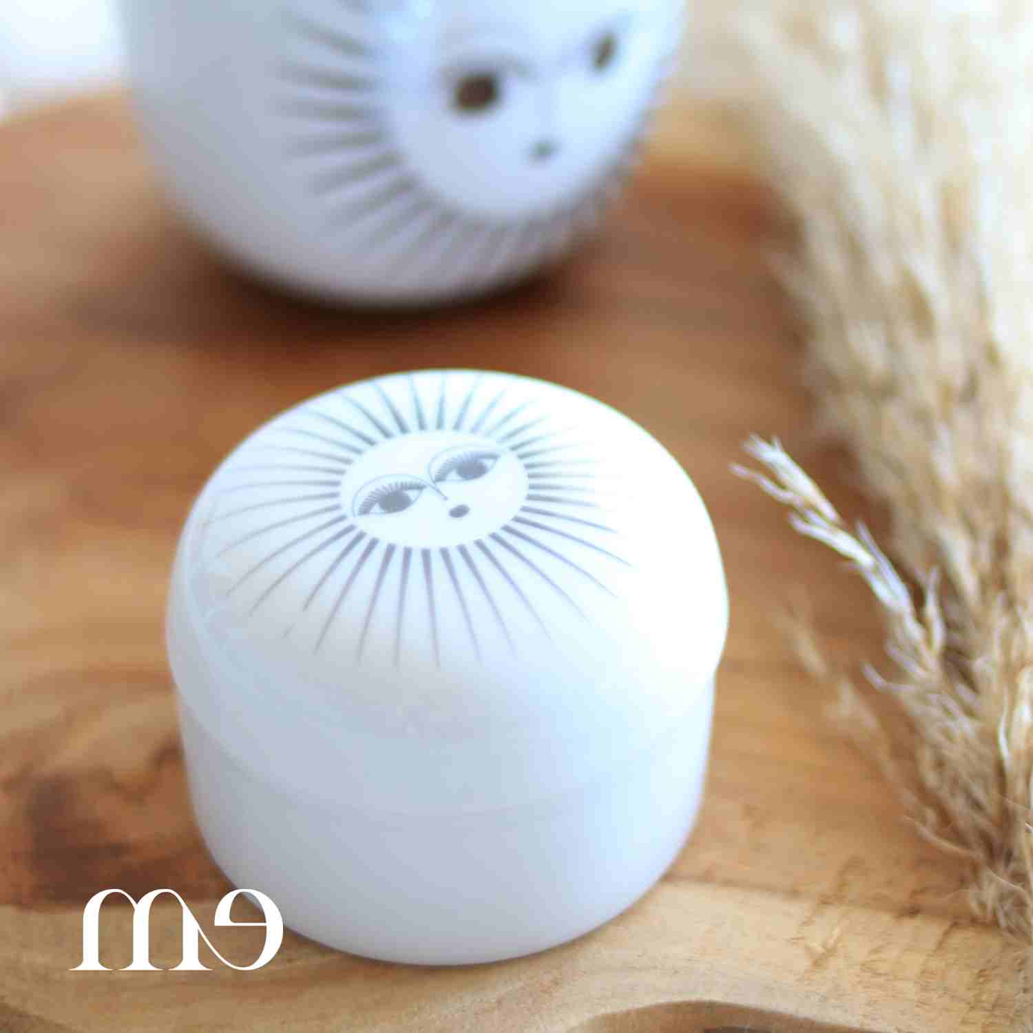 Cette boîte ronde en porcelaine blanche est surmontée d’un élégant soleil argenté au visage serein. Idéale pour y glisser tes bijoux, des petits mots ou tout ce que tu veux garder précieusement.