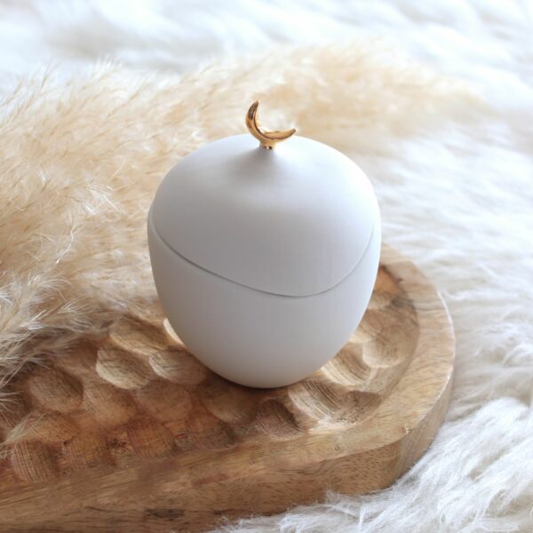 Cette boîte en porcelaine blanche joue la poésie jusque dans les détails. Avec sa forme asymétrique et son couvercle orné d’une lune dorée délicatement posée, elle devient un véritable petit écrin pour tes trésors du quotidien.