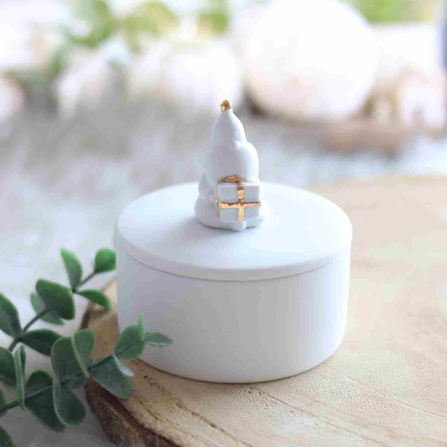 Un concentré de magie à poser partout ! Cette jolie boîte en porcelaine blanche est surmontée d’un Père Noël délicatement doré, pour une touche festive et raffinée