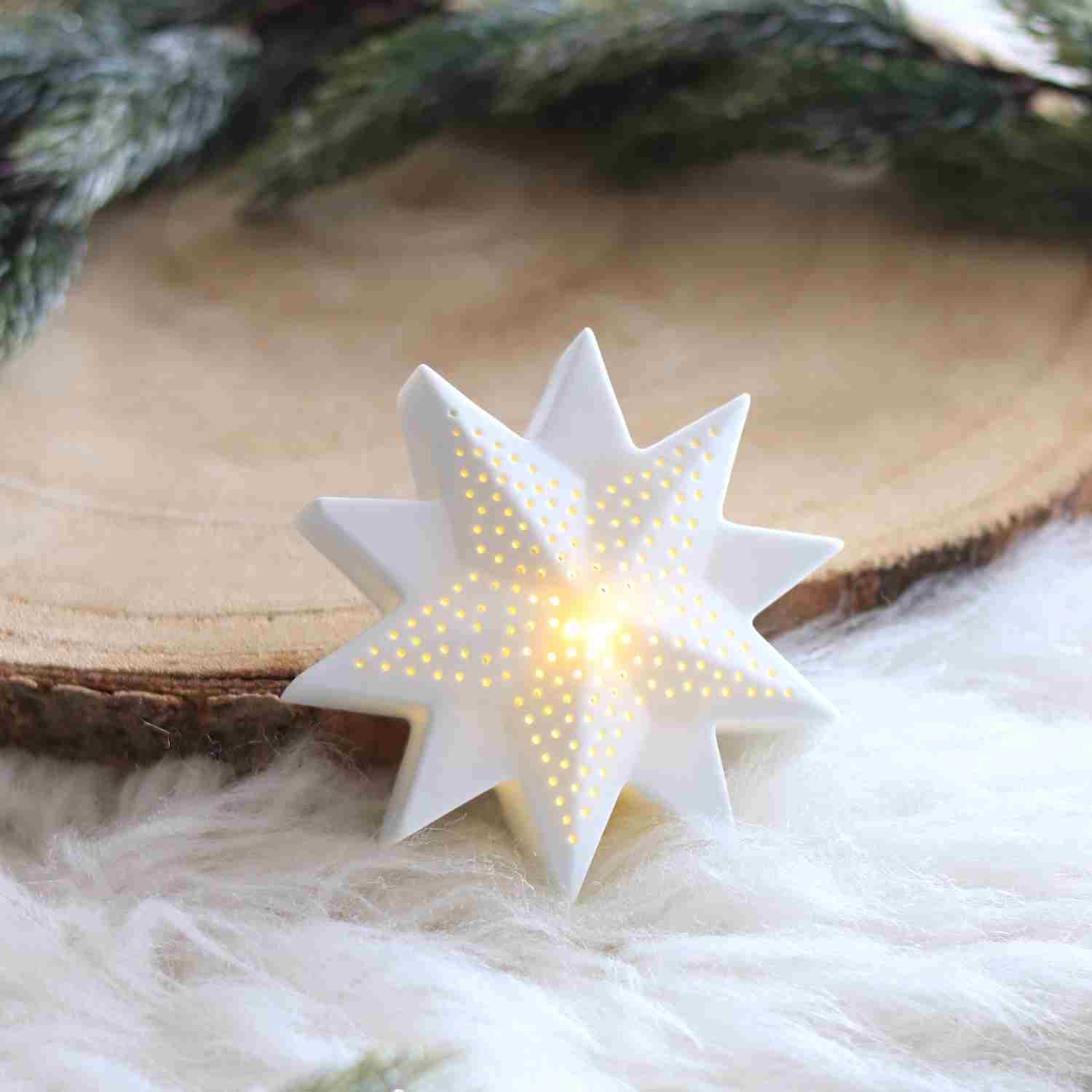 En porcelaine microperforée, elle diffuse une lumière douce et poétique, idéale pour illuminer une étagère, une table de fête ou un rebord de fenêtre.