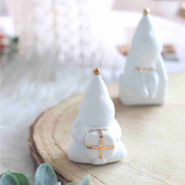 Petit par la taille mais grand par la magie ✨ Ce Père Noël en porcelaine blanche tient précieusement un cadeau doré entre ses mains.