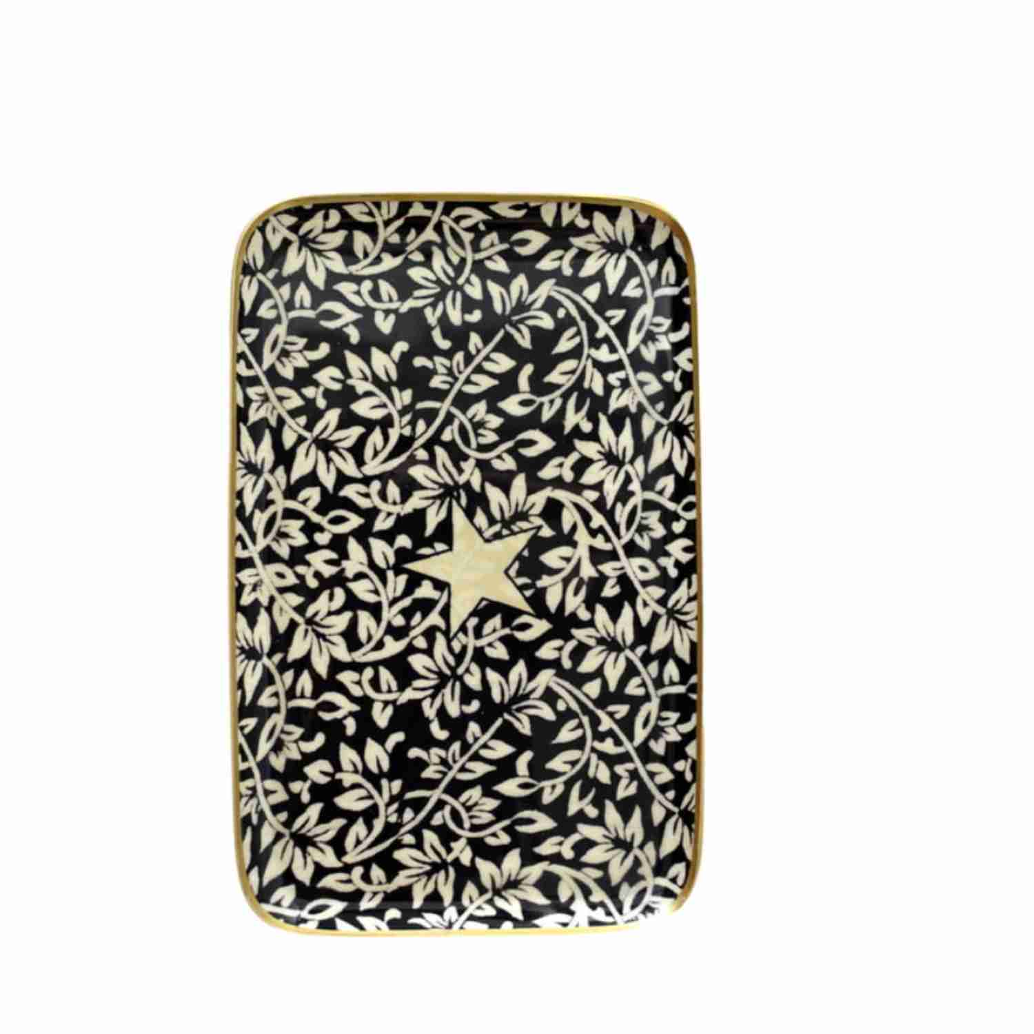 La bordure dorée peinte à la main apporte une touche artisanale précieuse, fidèle à l’univers raffiné de la marque. Grâce à ses grandes dimensions (42 x 26,5 x 2 cm), il est aussi esthétique que fonctionnel : parfait pour une table basse, un plateau de service, ou comme support déco sur une console ou une commode.