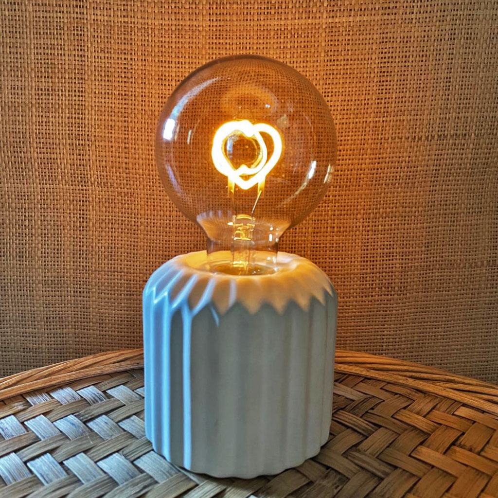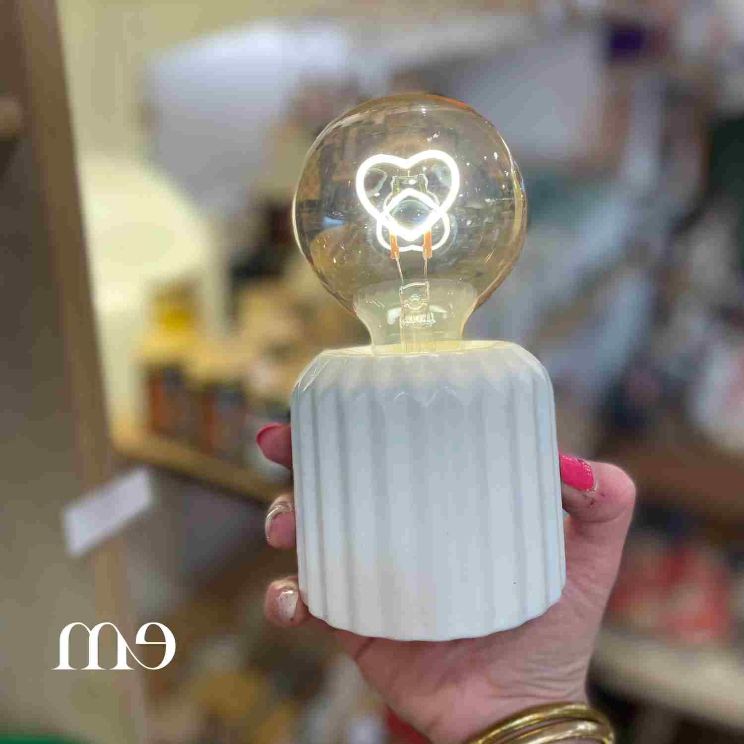 Cette lampe en céramique blanche est équipée d’une ampoule LED à filament en forme de cœur. Sans fil, elle s’allume d’un simple geste grâce à son interrupteur dessous.