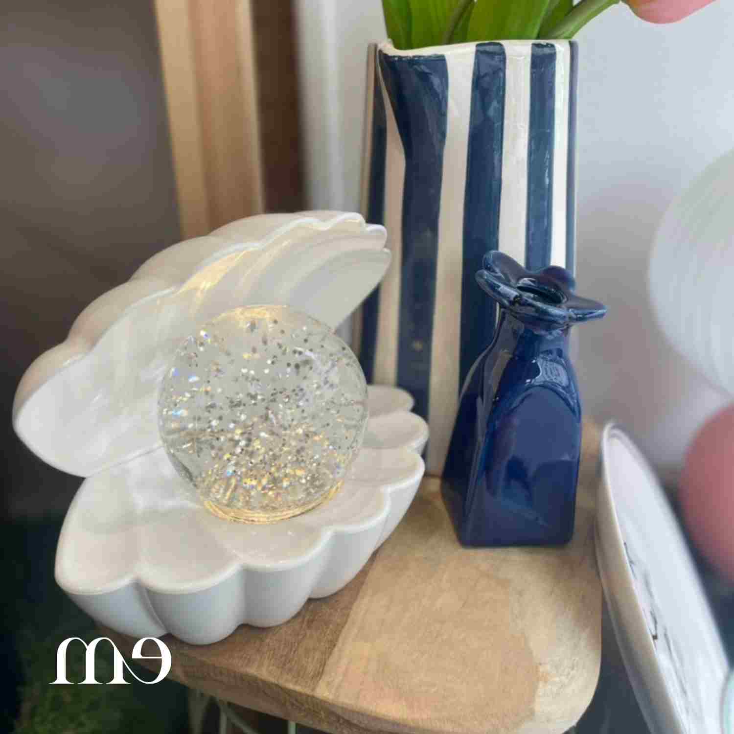 La lampe Coki en forme de coquillage diffuse une douce lumière grâce à sa boule LED brillante et remplie de paillettes qui tournoient comme par enchantement.