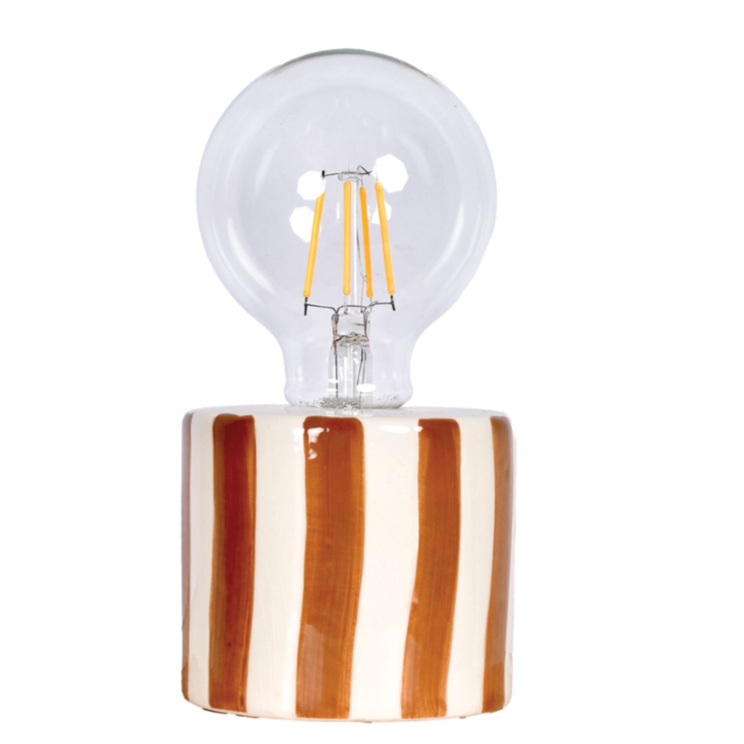 Chaleureuse et intemporelle, cette lampe LED à rayures marron diffuse une lumière douce, comme une petite bougie posée pour réchauffer l’ambiance.
