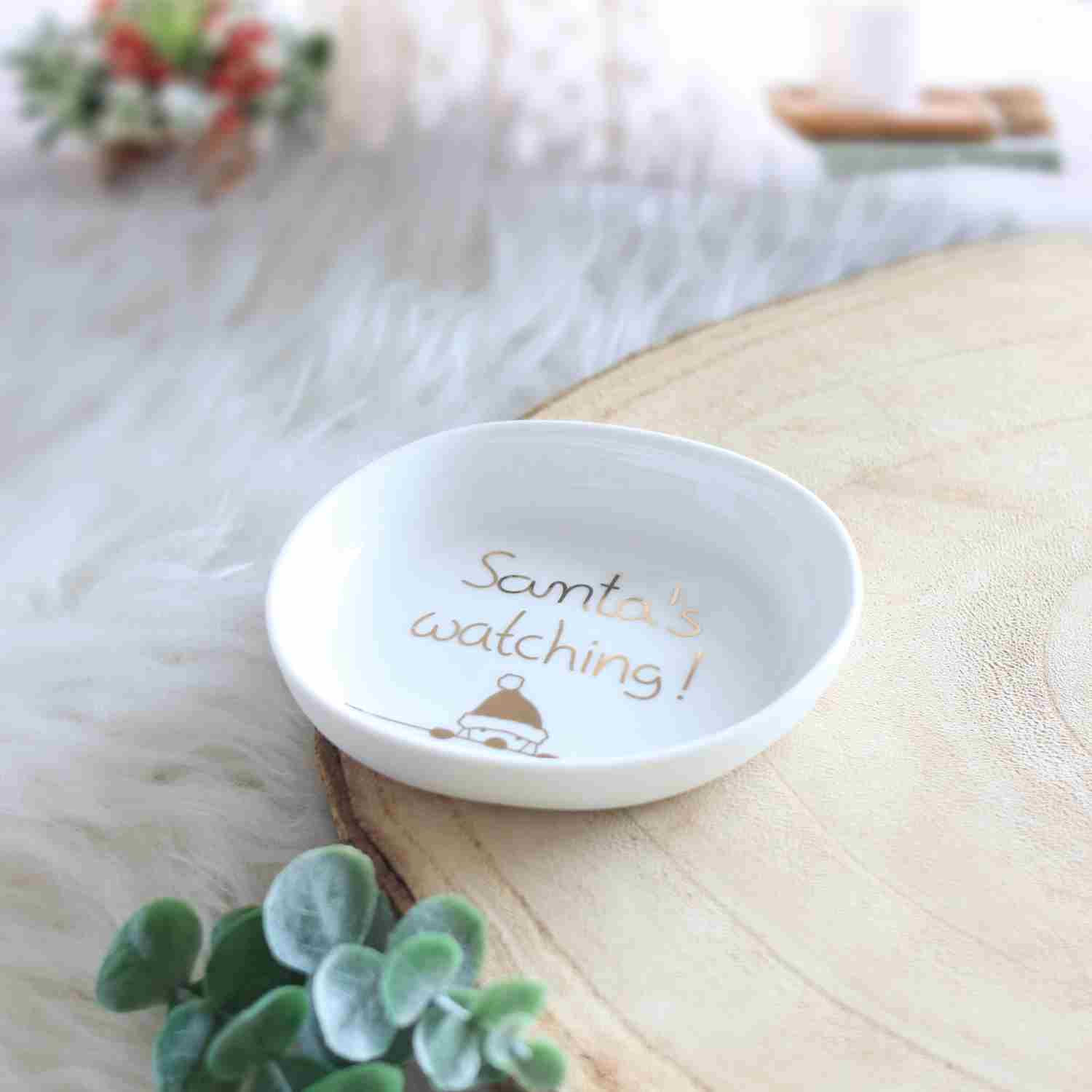 Une touche d’humour et de féérie pour ta déco de Noël ! Cette petite assiette en porcelaine blanche est ornée d’une inscription dorée Santa’s Watching — un clin d’œil malicieux au Père Noël qui garde toujours un œil ouvert 👀✨.