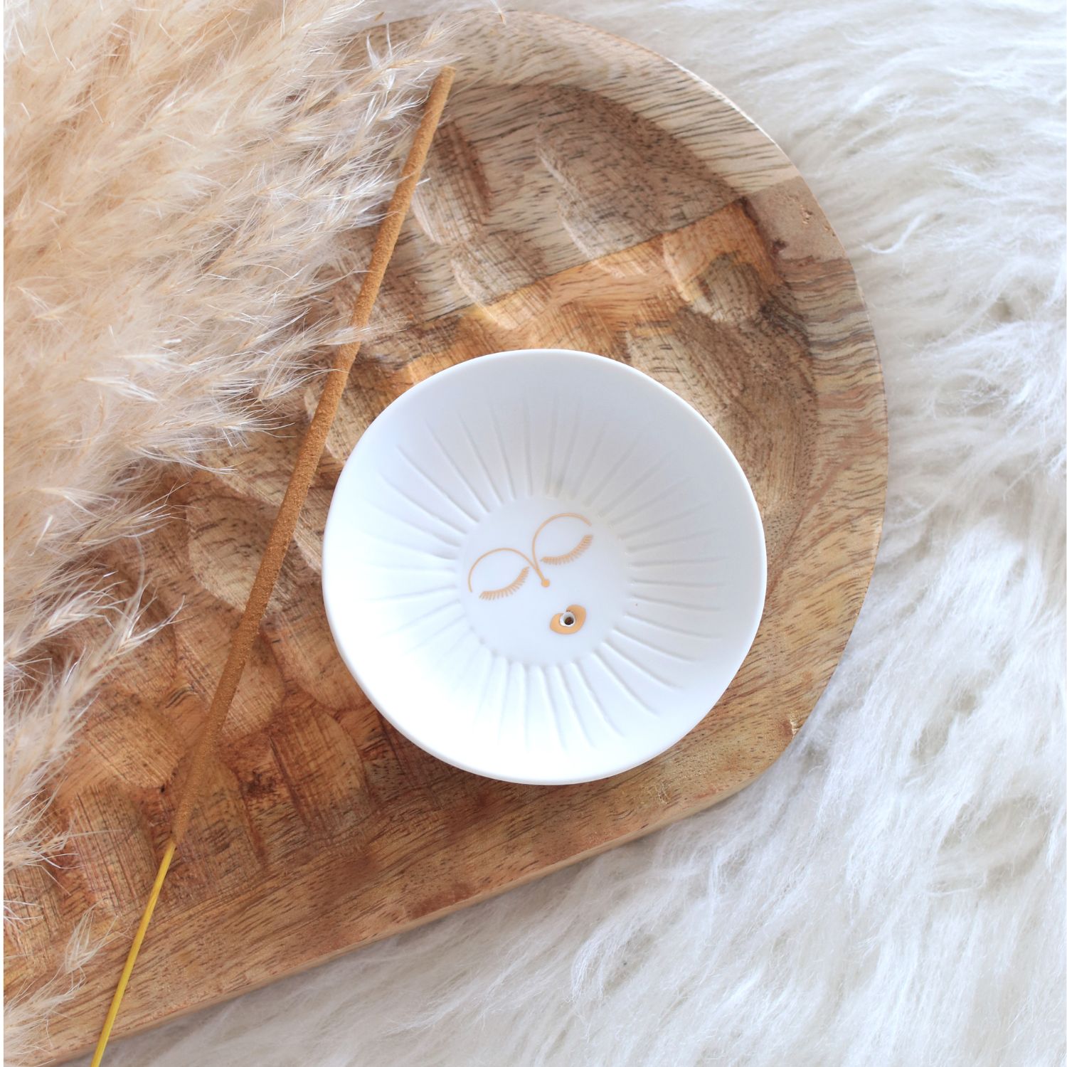 Un petit disque solaire qui rayonne de douceur. Ce porte-encens rond en porcelaine blanche repose sur de fins pieds et dévoile en son centre un visage lumineux et enjoué. Il accompagne tes instants parfumés en y ajoutant une note poétique et positive, fidèle à l’univers délicat de Räder.