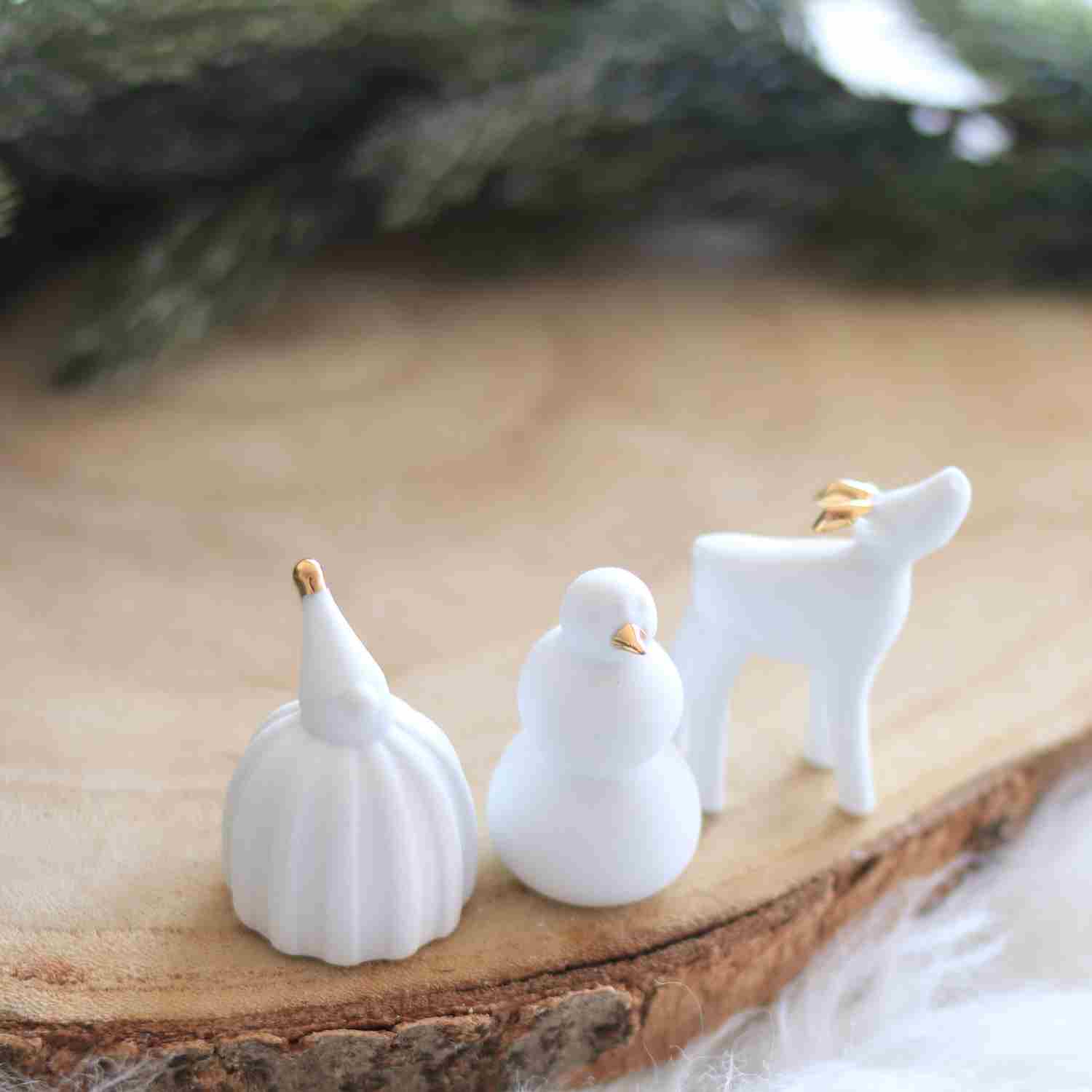 Ce set de 3 figurines en porcelaine Räder réunit un renne, un bonhomme de neige et un lutin, chacun délicatement rehaussé d’une touche de dorure.
