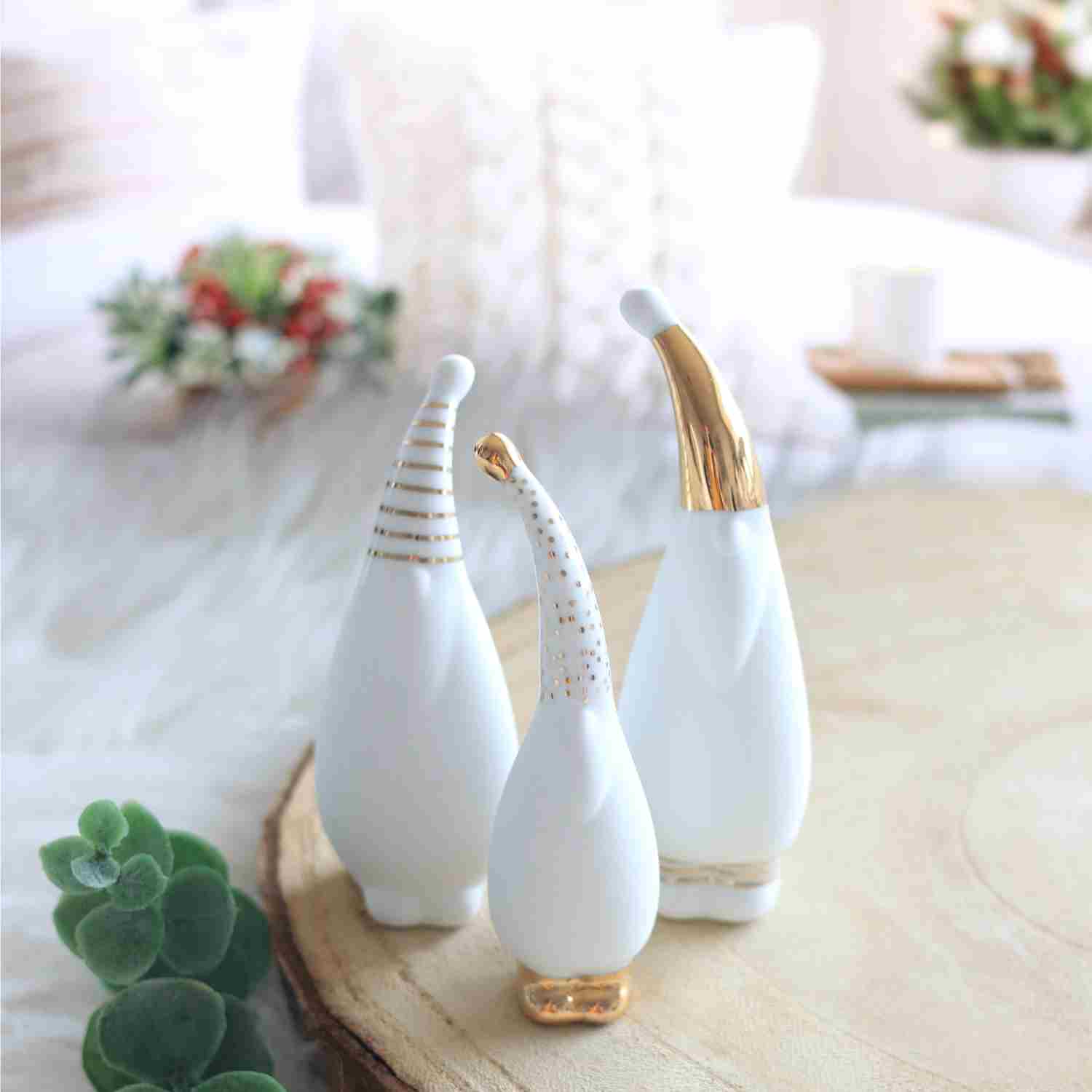 Trois petits Pères Noël pour trois fois plus de magie 🎄 Ces figurines en porcelaine blanche, rehaussées de touches dorées délicates, affichent chacune une posture différente. Ensemble, elles créent une scène pleine de charme et de poésie, parfaite pour illuminer ta déco de fête.