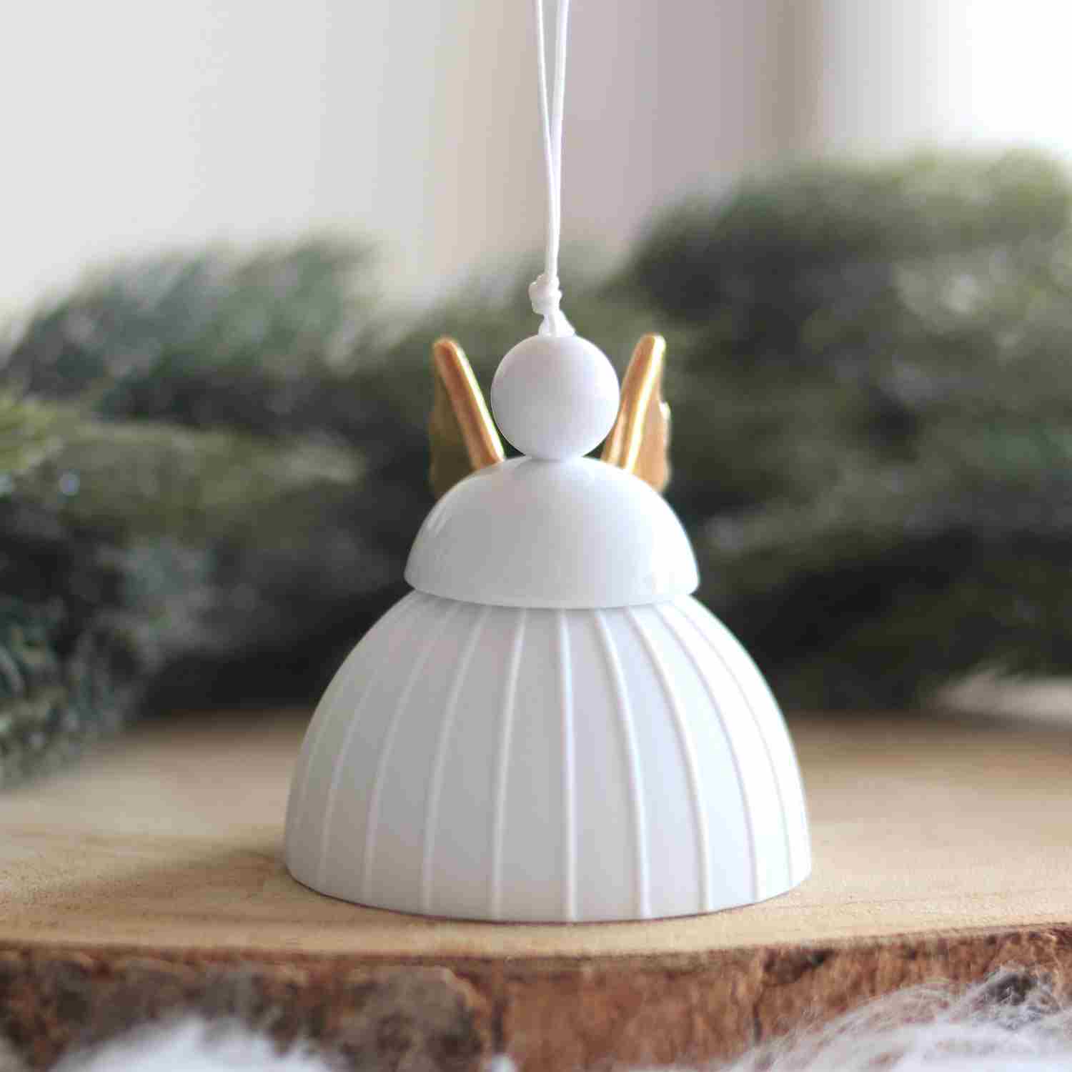 Cette suspension en porcelaine représente une douce Lady Bell aux ailes dorées, symbole de légèreté et de bienveillance.