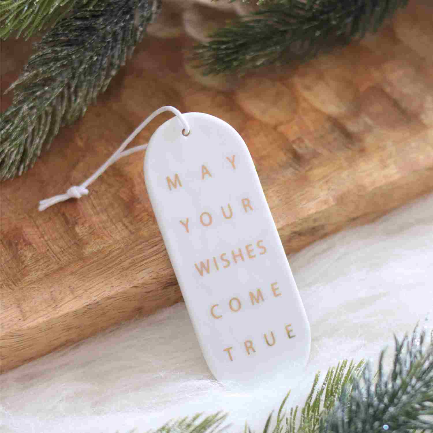 Cette suspension en porcelaine blanche partiellement émaillée signée Räder est délicatement ornée de l’inscription dorée “May your wishes”, accompagnée d’un gaufrage fin et raffiné.