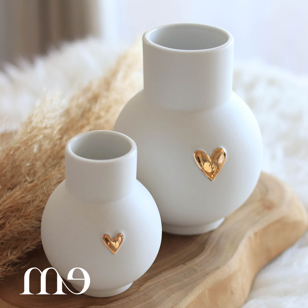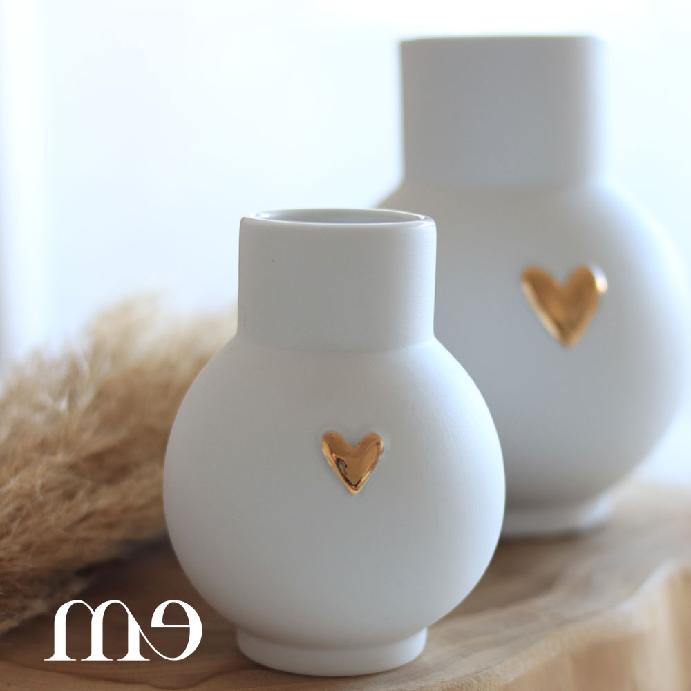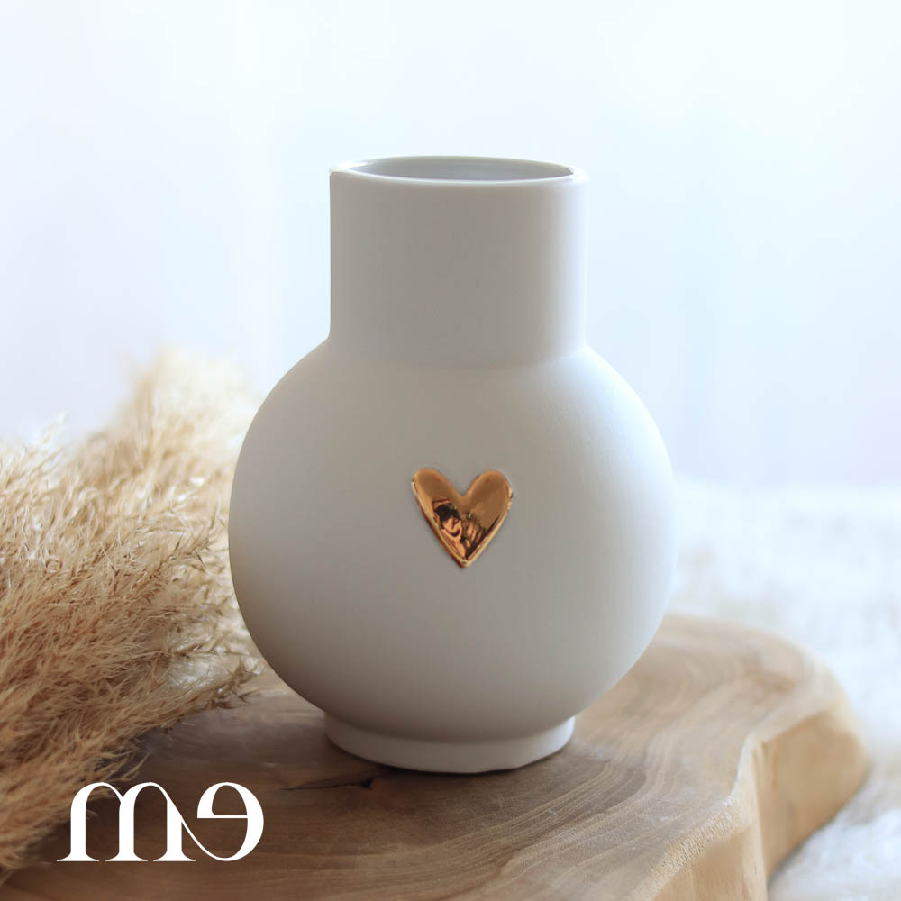Magnifique vase à la forme arrondie en porcelaine mate avec cœur dorée. Existe en 2 tailles : S et M. Je conseille de les mettre par deux pour un ensemble harmonieux.