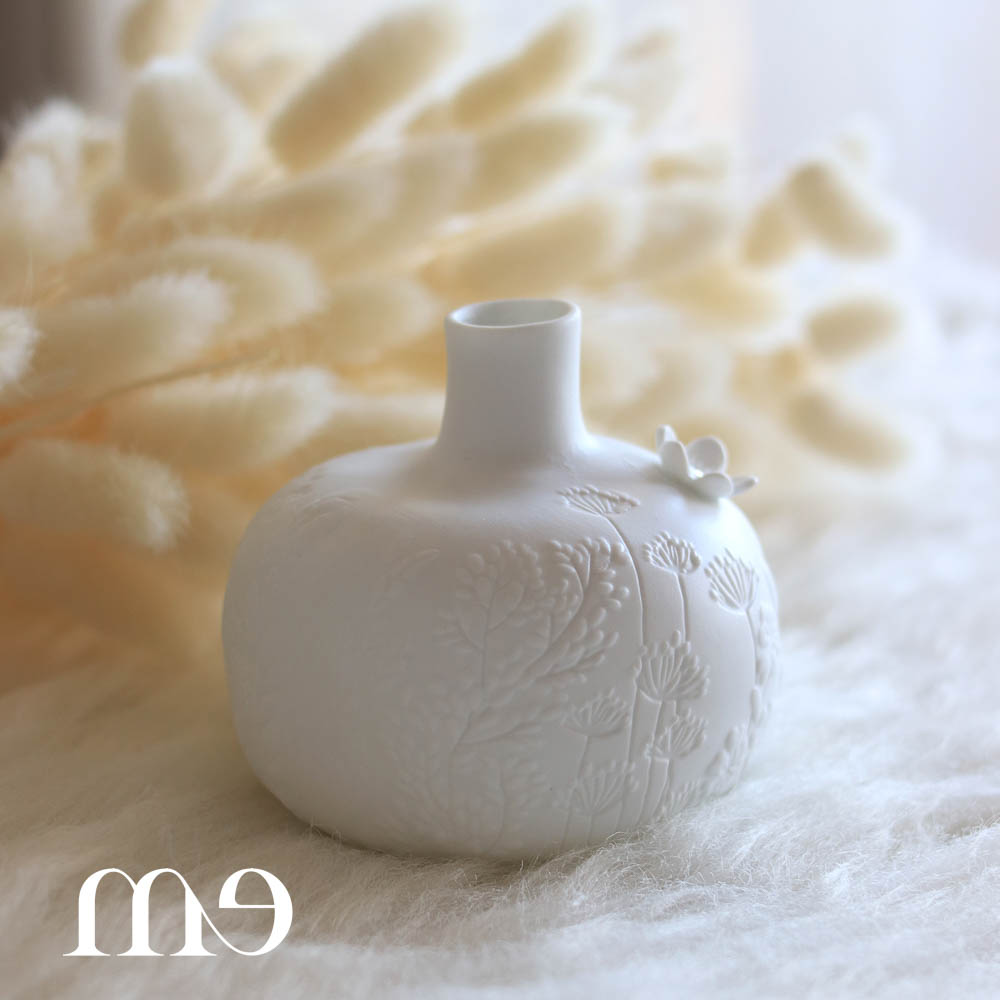 Petit vase délicat avec ses reliefs fleuris et sa fleur posé sur l’arrondi de celui-ci. C’est un hymne à la nature et à la poésie. Il est émaillé à l’intérieur donc vous pouvez y glisser les fleurs du jardin.