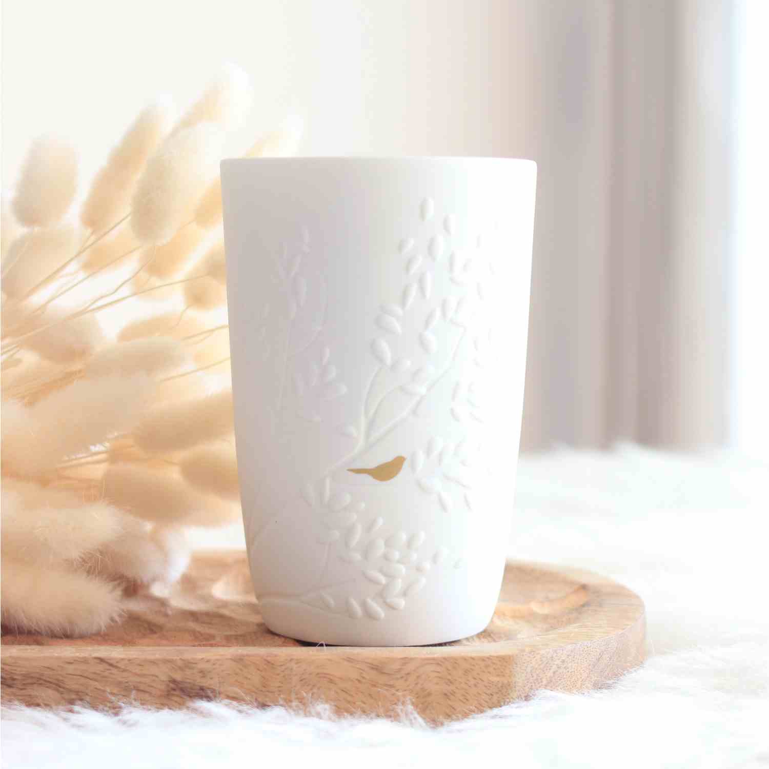 Ce vase en porcelaine blanche est une véritable pièce poétique, délicatement décorée d’un oiseau doré en relief. Symbole de liberté et de douceur, il apporte une touche lumineuse et raffinée à ta décoration, qu’il soit posé seul ou accompagné de quelques fleurs fraîches ou séchées.